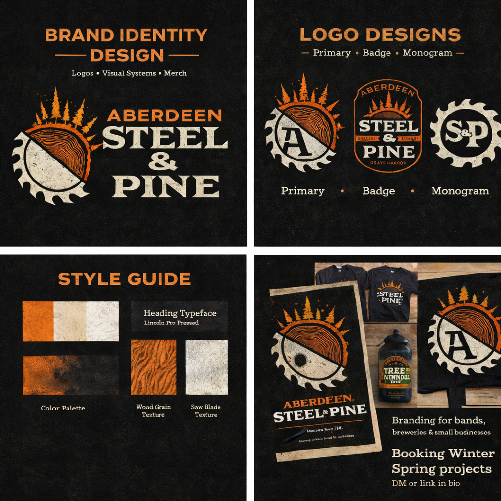 Each system shown here takes a core logo and builds outward—defining colors, type, and supporting graphics so the brand feels cohesive wherever it shows up, from posters to packaging to merch.